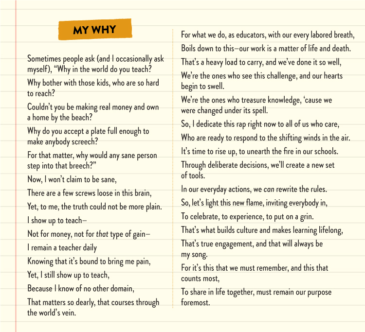 I, among other things, define myself as a rapper, and it’s a fact of which my students are all too aware—“Is he really rapping on the first day of school?” I use raps to hook my readers (did it work?), to bring literary characters to life, to commemorate momentous occasions, and, most of all, to inject the world inside and outside of the classroom with a bit of the extraordinary.