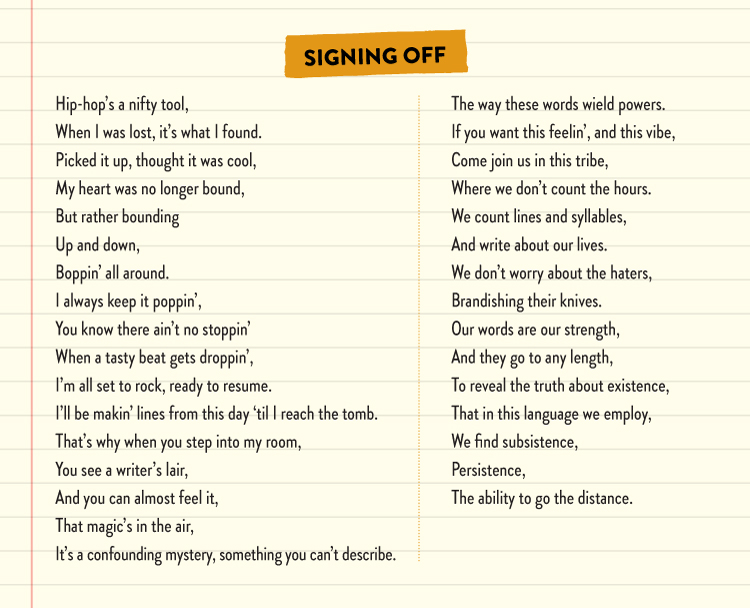 I thought I’d inject a little competition to see if I could scare up more excitement and creativity. “Next class,” I said, “we will be pairing our best rhymes anonymously for a rap battle.” Nothing like the pressure of an audience to produce results. The students quickly got to work and cooked up some solid lines.